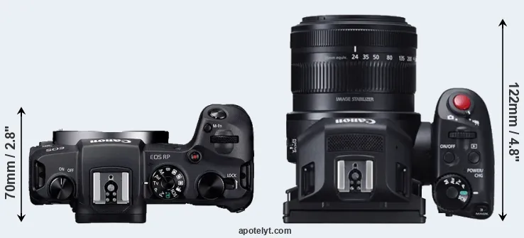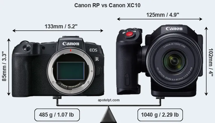 An illustration of the physical size and weight of the Canon RP and the Canon XC10 is provided in the side-by-side display below. The two cameras are presented according to their relative size. Three consecutive perspectives from the front, the top, and the back are available. All size dimensions are rounded to the nearest millimeter.