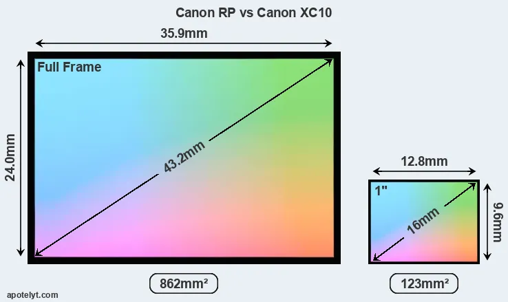 Of the two cameras under consideration, the Canon RP features a full frame sensor and the Canon XC10 an one-inch sensor. The sensor area in the XC10 is 86 percent smaller. As a result of these sensor size differences, the cameras have a format factor of, respectively, 1.0 and 2.75. The sensor in the RP has a native 3:2 aspect ratio, while the one in the XC10 offers a 4:3 aspect.