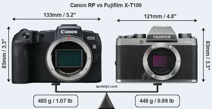 The side-by-side display below illustrates the physical size and weight of the Canon RP and the Fujifilm X-T100. The two cameras are presented according to their relative size. Three successive views from the front, the top, and the rear are shown. All width, height and depth measures are rounded to the nearest millimeter.