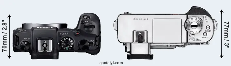 The physical size and weight of the Canon RP and the Leica Digilux 3 are illustrated in the side-by-side display below. The two cameras are presented according to their relative size. Three consecutive perspectives from the front, the top, and the back are available. All width, height and depth measures are rounded to the nearest millimeter.