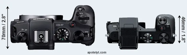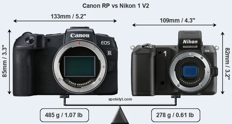 The physical size and weight of the Canon RP and the Nikon 1 V2 are illustrated in the side-by-side display below. The two cameras are presented according to their relative size. Three consecutive perspectives from the front, the top, and the back are available. All width, height and depth dimensions are rounded to the nearest millimeter.