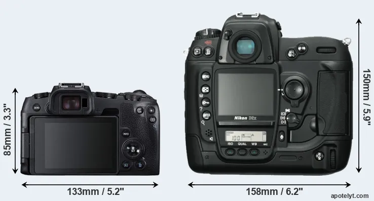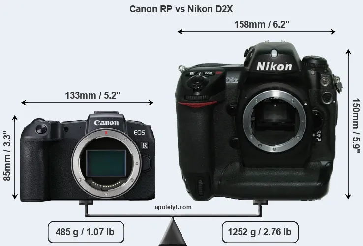 An illustration of the physical size and weight of the Canon RP and the Nikon D2X is provided in the side-by-side display below. The two cameras are presented according to their relative size. Three successive views from the front, the top, and the rear are shown. All width, height and depth dimensions are rounded to the nearest millimeter.