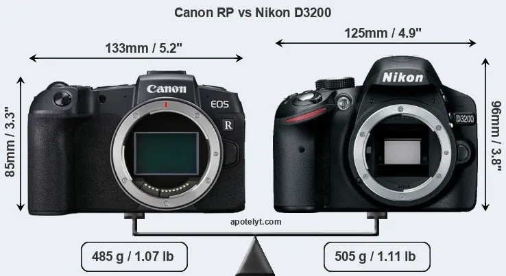 The side-by-side display below illustrates the physical size and weight of the Canon RP and the Nikon D3200. The two cameras are presented according to their relative size. Three consecutive perspectives from the front, the top, and the back are available. All width, height and depth measures are rounded to the nearest millimeter.
