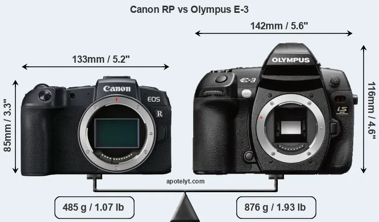 The side-by-side display below illustrates the physical size and weight of the Canon RP and the Olympus E-3. The two cameras are presented according to their relative size. Three successive views from the front, the top, and the rear are shown. All size dimensions are rounded to the nearest millimeter.
