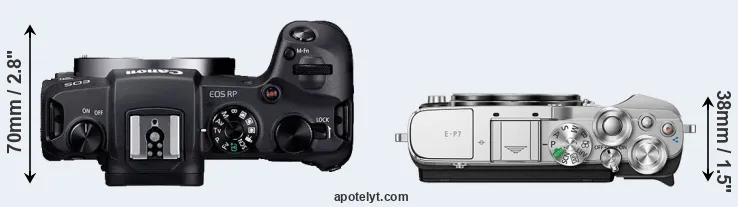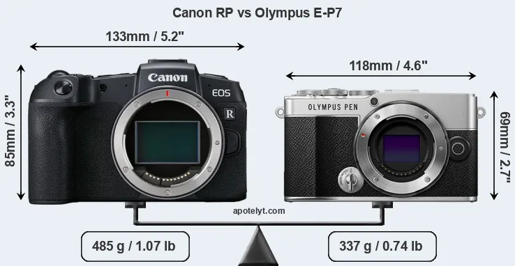 The side-by-side display below illustrates the physical size and weight of the Canon RP and the Olympus E-P7. The two cameras are presented according to their relative size. Three consecutive perspectives from the front, the top, and the back are available. All size dimensions are rounded to the nearest millimeter.