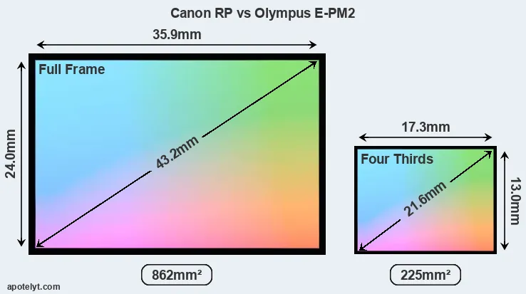 Of the two cameras under consideration, the Canon RP features a full frame sensor and the Olympus E-PM2 a Four Thirds sensor. The sensor area in the E-PM2 is 74 percent smaller. As a result of these sensor size differences, the cameras have a format factor of, respectively, 1.0 and 2.0. The sensor in the RP has a native 3:2 aspect ratio, while the one in the E-PM2 offers a 4:3 aspect.