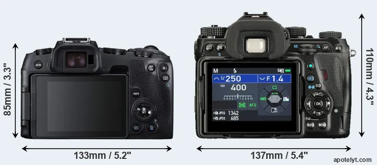 The physical size and weight of the Canon RP and the Pentax K-1 II are illustrated in the side-by-side display below. The two cameras are presented according to their relative size. Three consecutive views from the front, the top, and the rear side are shown. All size dimensions are rounded to the nearest millimeter.