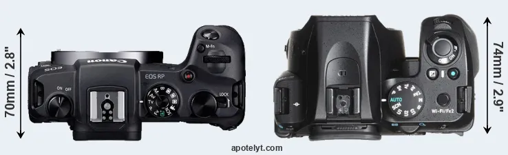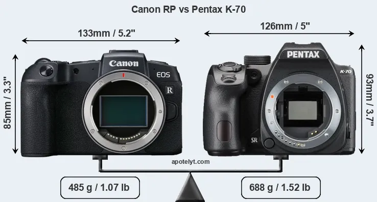 The physical size and weight of the Canon RP and the Pentax K-70 are illustrated in the side-by-side display below. The two cameras are presented according to their relative size. Three successive views from the front, the top, and the rear are shown. All width, height and depth measures are rounded to the nearest millimeter.