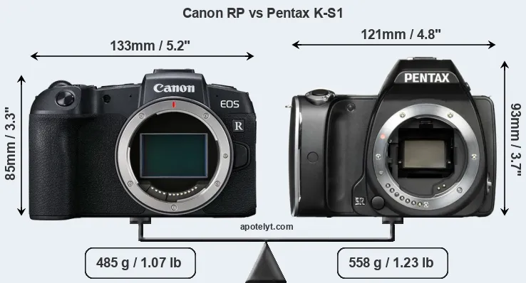 If the front view area (width x height) of the cameras is taken as an aggregate measure of their size, the Canon RP and the Pentax K-S1 are of equal size. However, the K-S1 is markedly heavier (15 percent) than the RP. In this context, it is worth noting that neither the RP nor the K-S1 are weather-sealed.