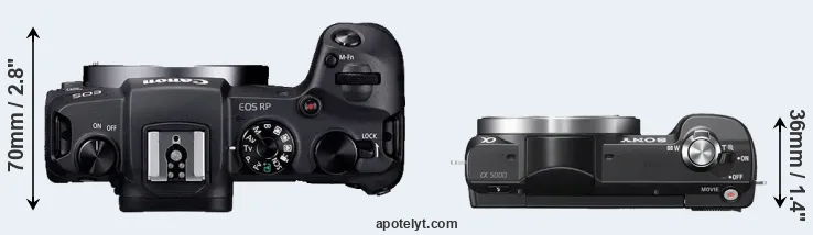 An illustration of the physical size and weight of the Canon RP and the Sony A5000 is provided in the side-by-side display below. The two cameras are presented according to their relative size. Three consecutive views from the front, the top, and the rear side are shown. All width, height and depth measures are rounded to the nearest millimeter.