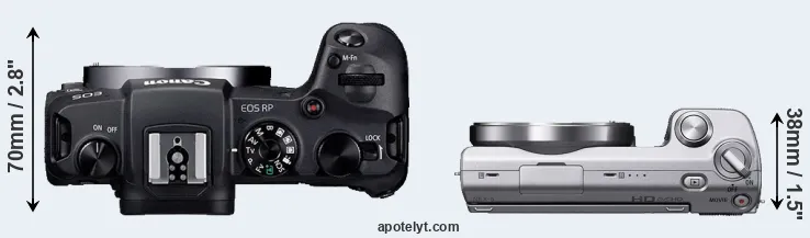 The physical size and weight of the Canon RP and the Sony NEX-5 are illustrated in the side-by-side display below. The two cameras are presented according to their relative size. Three consecutive perspectives from the front, the top, and the back are available. All width, height and depth measures are rounded to the nearest millimeter.