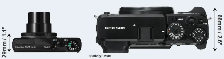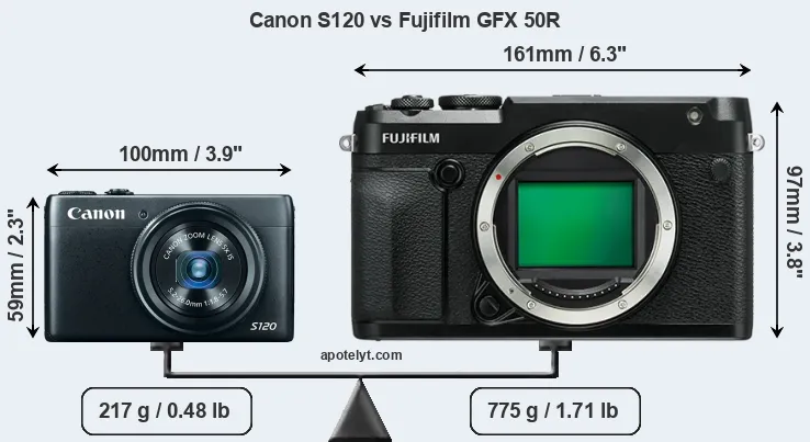 An illustration of the physical size and weight of the Canon S120 and the Fujifilm GFX 50R is provided in the side-by-side display below. The two cameras are presented according to their relative size. Three successive views from the front, the top, and the rear are shown. All width, height and depth dimensions are rounded to the nearest millimeter.