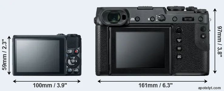 If the front view area (width x height) of the cameras is taken as an aggregate measure of their size, the Fujifilm GFX 50R is considerably larger (165 percent) than the Canon S120. It is noteworthy in this context that the GFX 50R is splash and dust-proof, while the S120 does not feature any corresponding weather-sealing.