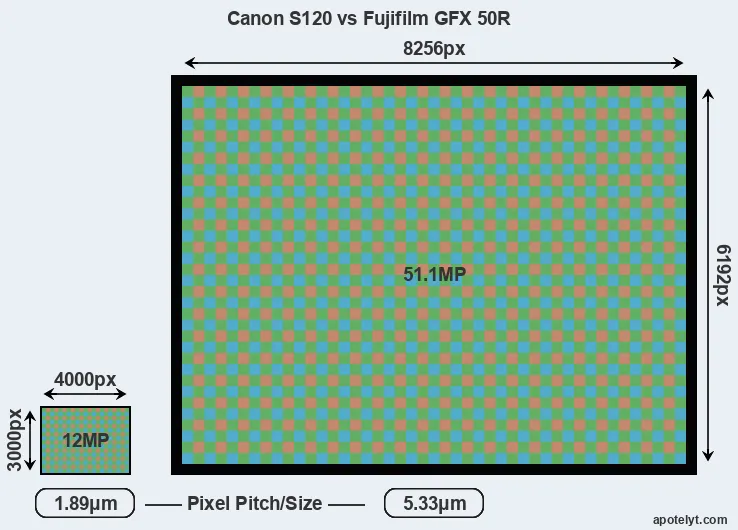 | Sensor Specs | Canon S120 | Fujifilm GFX 50R |