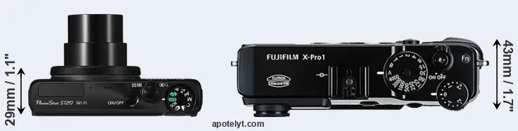 If the front view area (width x height) of the cameras is taken as an aggregate measure of their size, the Fujifilm X-Pro1 is considerably larger (95 percent) than the Canon S120. In this context, it is worth noting that neither the S120 nor the X-Pro1 are weather-sealed.