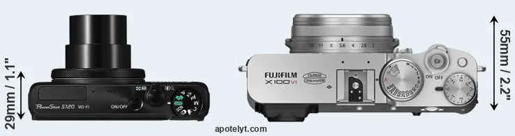 The physical size and weight of the Canon S120 and the Fujifilm X100VI are illustrated in the side-by-side display below. The two cameras are presented according to their relative size. Three consecutive views from the front, the top, and the rear side are shown. All size dimensions are rounded to the nearest millimeter.