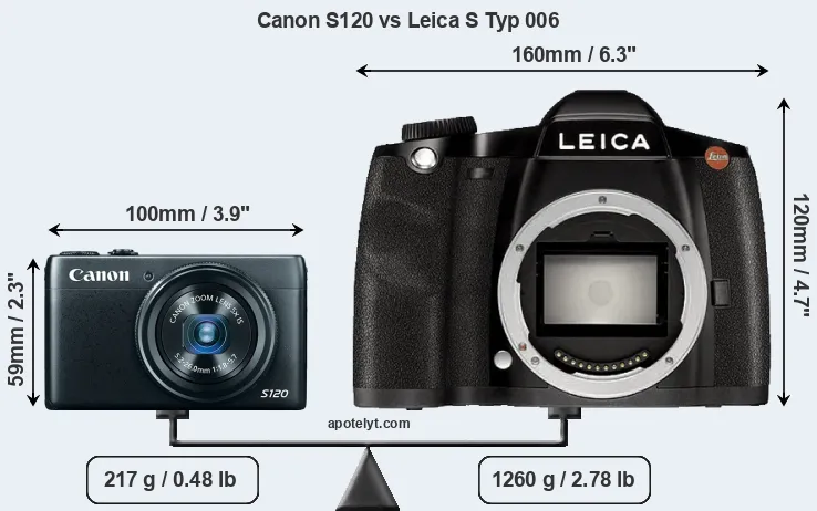 An illustration of the physical size and weight of the Canon S120 and the Leica S Typ 006 is provided in the side-by-side display below. The two cameras are presented according to their relative size. Three consecutive perspectives from the front, the top, and the back are available. All width, height and depth measures are rounded to the nearest millimeter.