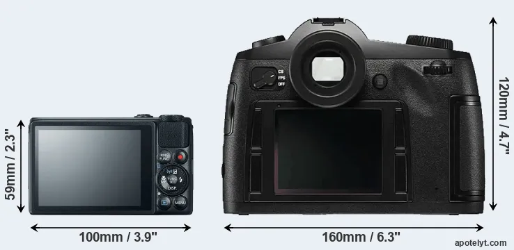 If the front view area (width x height) of the cameras is taken as an aggregate measure of their size, the Leica S Typ 006 is considerably larger (225 percent) than the Canon S120. It is noteworthy in this context that the S Typ 006 is splash and dust-proof, while the S120 does not feature any corresponding weather-sealing.