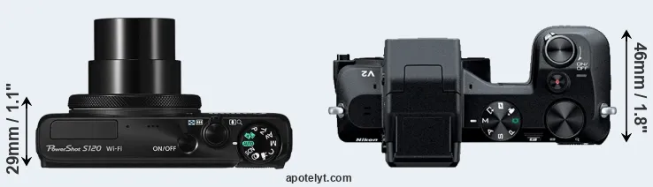 The physical size and weight of the Canon S120 and the Nikon 1 V2 are illustrated in the side-by-side display below. The two cameras are presented according to their relative size. Three consecutive views from the front, the top, and the rear side are shown. All size dimensions are rounded to the nearest millimeter.