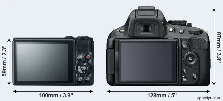 If the front view area (width x height) of the cameras is taken as an aggregate measure of their size, the Nikon D5100 is considerably larger (110 percent) than the Canon S120. In this context, it is worth noting that neither the S120 nor the D5100 are weather-sealed.