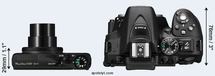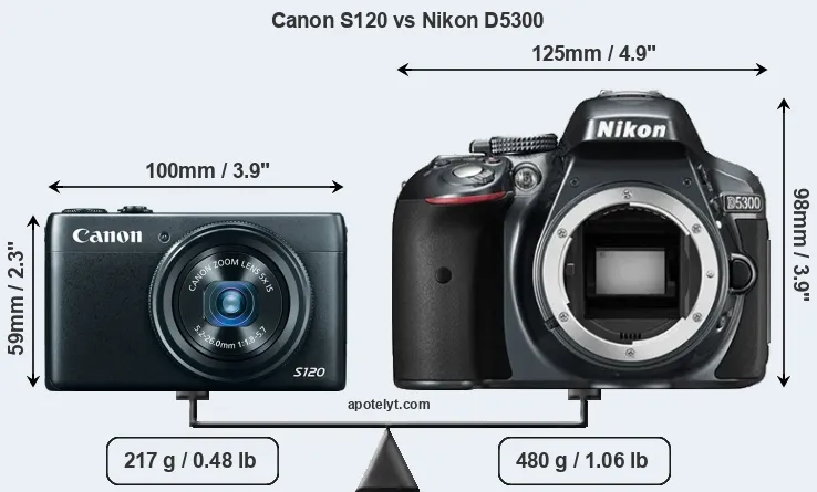 The side-by-side display below illustrates the physical size and weight of the Canon S120 and the Nikon D5300. The two cameras are presented according to their relative size. Three consecutive perspectives from the front, the top, and the back are available. All width, height and depth dimensions are rounded to the nearest millimeter.