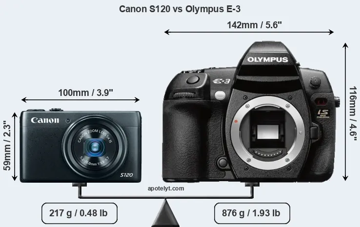 An illustration of the physical size and weight of the Canon S120 and the Olympus E-3 is provided in the side-by-side display below. The two cameras are presented according to their relative size. Three successive views from the front, the top, and the rear are shown. All width, height and depth dimensions are rounded to the nearest millimeter.
