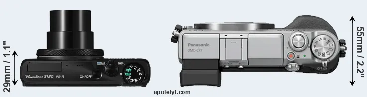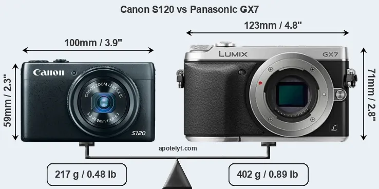 If the front view area (width x height) of the cameras is taken as an aggregate measure of their size, the Panasonic GX7 is considerably larger (48 percent) than the Canon S120. In this context, it is worth noting that neither the S120 nor the GX7 are weather-sealed.