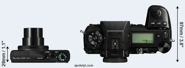 An illustration of the physical size and weight of the Canon S120 and the Panasonic S1 is provided in the side-by-side display below. The two cameras are presented according to their relative size. Three consecutive views from the front, the top, and the rear side are shown. All width, height and depth measures are rounded to the nearest millimeter.