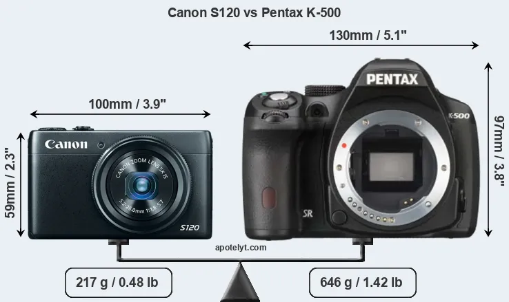 An illustration of the physical size and weight of the Canon S120 and the Pentax K-500 is provided in the side-by-side display below. The two cameras are presented according to their relative size. Three consecutive perspectives from the front, the top, and the back are available. All width, height and depth measures are rounded to the nearest millimeter.