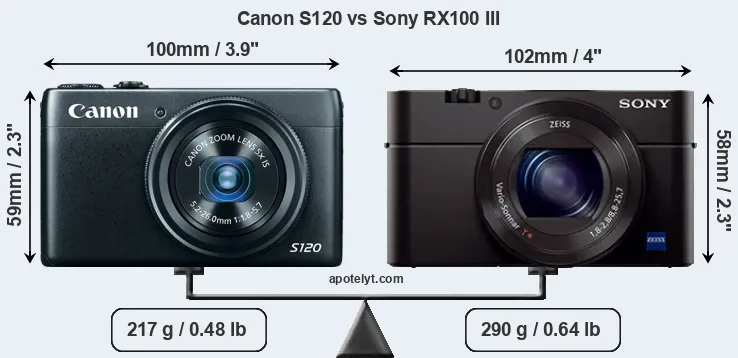 The side-by-side display below illustrates the physical size and weight of the Canon S120 and the Sony RX100 III. The two cameras are presented according to their relative size. Three successive views from the front, the top, and the rear are shown. All width, height and depth dimensions are rounded to the nearest millimeter.