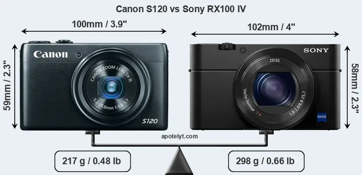The side-by-side display below illustrates the physical size and weight of the Canon S120 and the Sony RX100 IV. The two cameras are presented according to their relative size. Three successive views from the front, the top, and the rear are shown. All width, height and depth dimensions are rounded to the nearest millimeter.