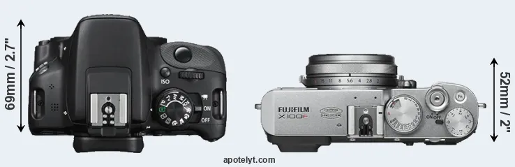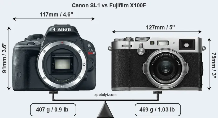 An illustration of the physical size and weight of the Canon SL1 and the Fujifilm X100F is provided in the side-by-side display below. The two cameras are presented according to their relative size. Three consecutive views from the front, the top, and the rear side are shown. All width, height and depth measures are rounded to the nearest millimeter.