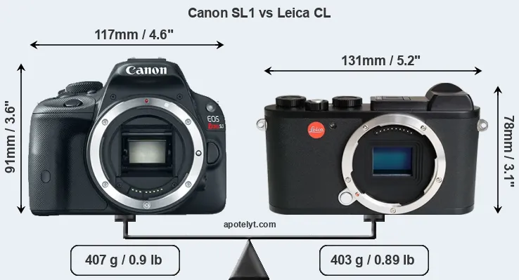 The side-by-side display below illustrates the physical size and weight of the Canon SL1 and the Leica CL. The two cameras are presented according to their relative size. Three consecutive perspectives from the front, the top, and the back are available. All width, height and depth dimensions are rounded to the nearest millimeter.