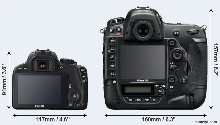 The physical size and weight of the Canon SL1 and the Nikon D4 are illustrated in the side-by-side display below. The two cameras are presented according to their relative size. Three consecutive views from the front, the top, and the rear side are shown. All size dimensions are rounded to the nearest millimeter.