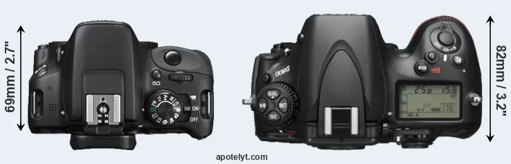 An illustration of the physical size and weight of the Canon SL1 and the Nikon D800 is provided in the side-by-side display below. The two cameras are presented according to their relative size. Three consecutive perspectives from the front, the top, and the back are available. All size dimensions are rounded to the nearest millimeter.