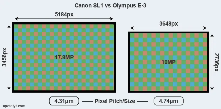 With 17.9MP, the SL1 offers a higher resolution than the E-3 (10MP), but the SL1 has smaller individual pixels (pixel pitch of 4.31μm versus 4.74μm for the E-3). However, the SL1 is a much more recent model (by 5 years and 5 months) than the E-3, and its sensor will have benefitted from technological advances during this time that enhance the light gathering capacity of its pixels.