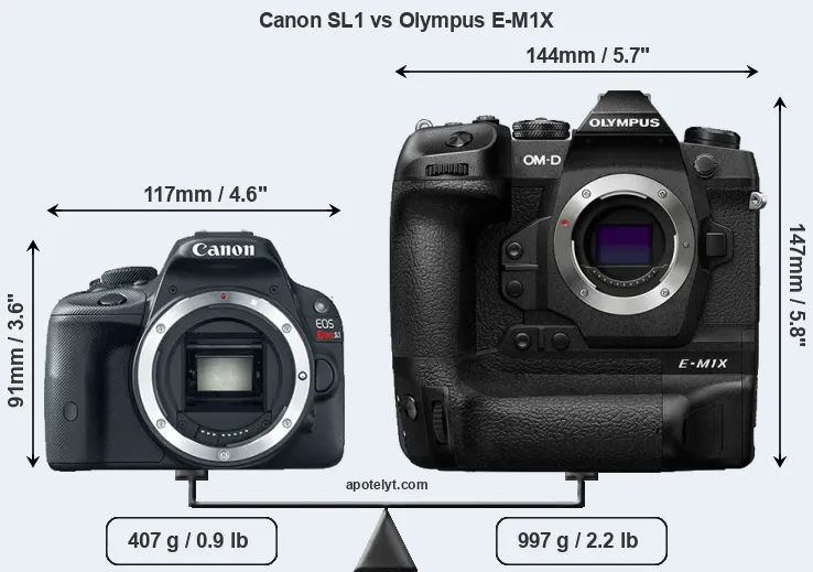 If the front view area (width x height) of the cameras is taken as an aggregate measure of their size, the Olympus E-M1X is considerably larger (99 percent) than the Canon SL1. Moreover, the E-M1X is substantially heavier (145 percent) than the SL1. It is noteworthy in this context that the E-M1X is splash and dust-proof, while the SL1 does not feature any corresponding weather-sealing.