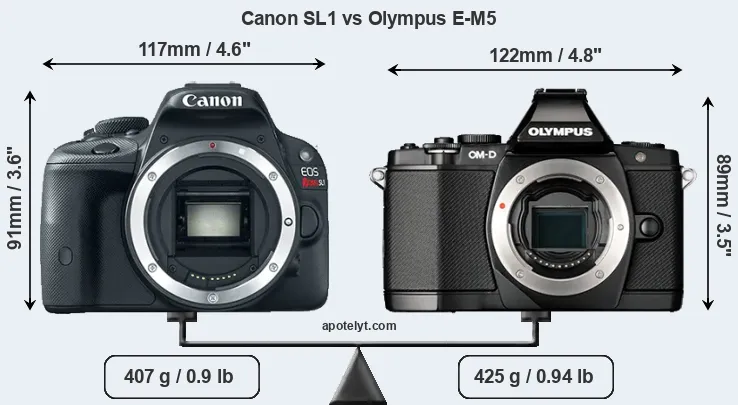 If the front view area (width x height) of the cameras is taken as an aggregate measure of their size, the Olympus E-M5 is somewhat larger (2 percent) than the Canon SL1. Moreover, the E-M5 is slightly heavier (4 percent) than the SL1. It is noteworthy in this context that the E-M5 is splash and dust-proof, while the SL1 does not feature any corresponding weather-sealing.