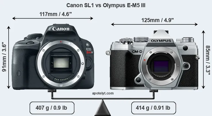 If the front view area (width x height) of the cameras is taken as an aggregate measure of their size, the Canon SL1 and the Olympus E-M5 III are of equal size. However, the E-M5 III is slightly heavier (2 percent) than the SL1. It is noteworthy in this context that the E-M5 III is splash and dust-proof, while the SL1 does not feature any corresponding weather-sealing.