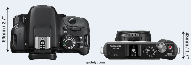 The above size and weight comparisons are to some extent incomplete and possibly misleading, as the LX5 has a lens built in, whereas the SL1 is an interchangeable lens camera that requires a separate lens. Attaching the latter will add extra weight and bulk to the setup. You can compare the optics available for the SL1 and their specifications in the Canon EF Lens Catalog.