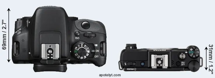 An illustration of the physical size and weight of the Canon SL1 and the Pentax Q is provided in the side-by-side display below. The two cameras are presented according to their relative size. Three consecutive perspectives from the front, the top, and the back are available. All width, height and depth measures are rounded to the nearest millimeter.