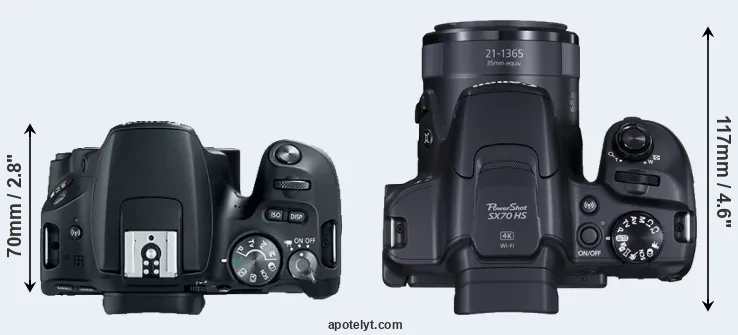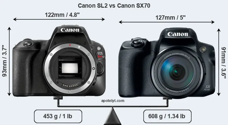The side-by-side display below illustrates the physical size and weight of the Canon SL2 and the Canon SX70. The two cameras are presented according to their relative size. Three consecutive perspectives from the front, the top, and the back are available. All width, height and depth measures are rounded to the nearest millimeter.