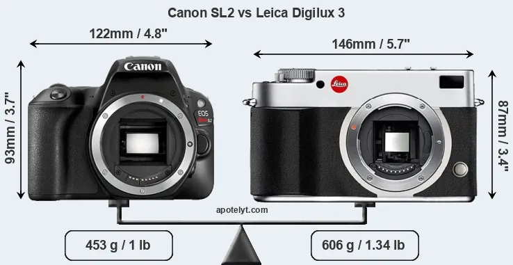 The physical size and weight of the Canon SL2 and the Leica Digilux 3 are illustrated in the side-by-side display below. The two cameras are presented according to their relative size. Three successive views from the front, the top, and the rear are shown. All size dimensions are rounded to the nearest millimeter.