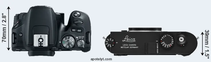 The physical size and weight of the Canon SL2 and the Leica M10-P are illustrated in the side-by-side display below. The two cameras are presented according to their relative size. Three consecutive perspectives from the front, the top, and the back are available. All width, height and depth dimensions are rounded to the nearest millimeter.