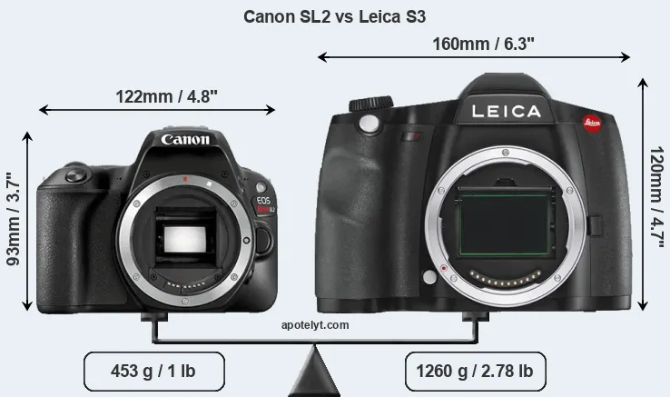 The side-by-side display below illustrates the physical size and weight of the Canon SL2 and the Leica S3. The two cameras are presented according to their relative size. Three successive views from the front, the top, and the rear are shown. All width, height and depth measures are rounded to the nearest millimeter.