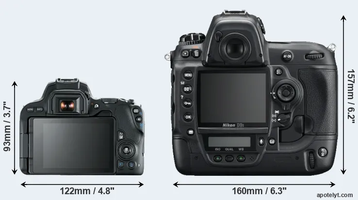 The side-by-side display below illustrates the physical size and weight of the Canon SL2 and the Nikon D3S. The two cameras are presented according to their relative size. Three consecutive perspectives from the front, the top, and the back are available. All width, height and depth dimensions are rounded to the nearest millimeter.
