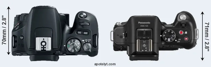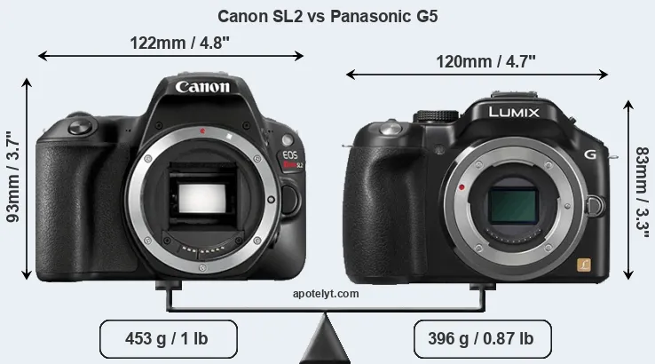 The physical size and weight of the Canon SL2 and the Panasonic G5 are illustrated in the side-by-side display below. The two cameras are presented according to their relative size. Three consecutive perspectives from the front, the top, and the back are available. All width, height and depth measures are rounded to the nearest millimeter.