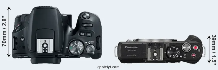 The side-by-side display below illustrates the physical size and weight of the Canon SL2 and the Panasonic GX1. The two cameras are presented according to their relative size. Three consecutive views from the front, the top, and the rear side are shown. All width, height and depth dimensions are rounded to the nearest millimeter.