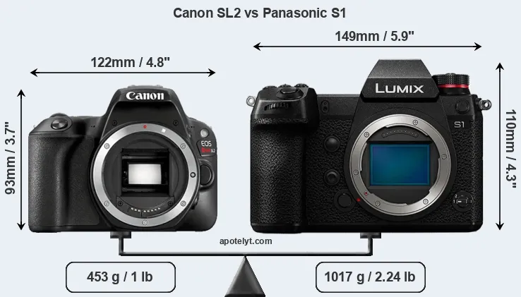 If the front view area (width x height) of the cameras is taken as an aggregate measure of their size, the Panasonic S1 is considerably larger (44 percent) than the Canon SL2. Moreover, the S1 is substantially heavier (125 percent) than the SL2. It is noteworthy in this context that the S1 is splash and dust-proof, while the SL2 does not feature any corresponding weather-sealing.