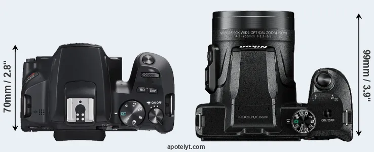 The side-by-side display below illustrates the physical size and weight of the Canon SL3 and the Nikon B600. The two cameras are presented according to their relative size. Three consecutive views from the front, the top, and the rear side are shown. All width, height and depth measures are rounded to the nearest millimeter.